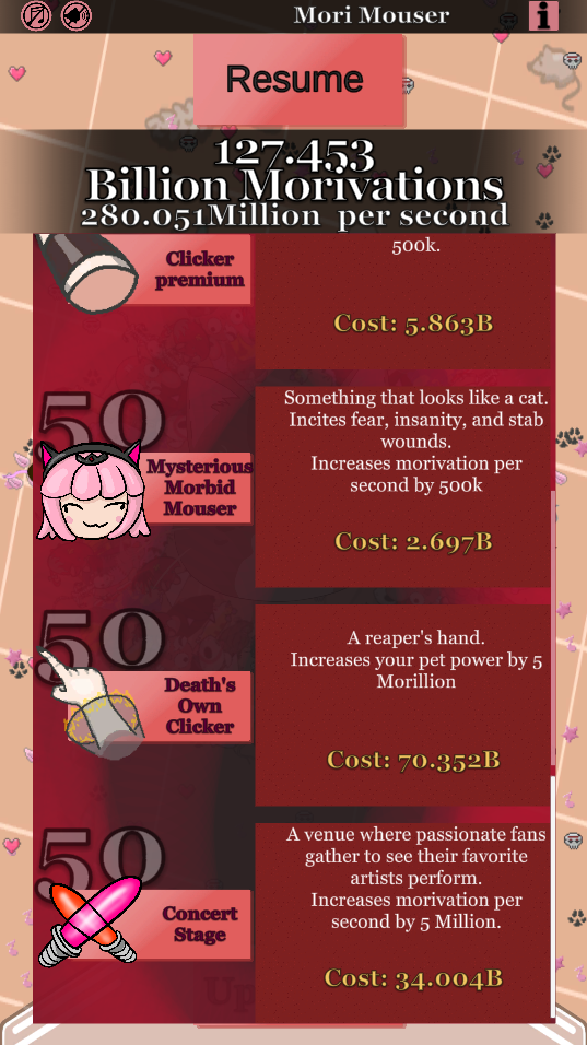 Mori Mouser is a Hololive fangame for and about Mori Calliope, in the style of Cookie Clicker, that allows you to get Morivated!